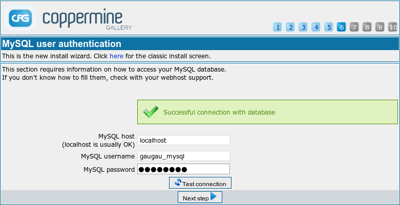 | This section requires information on how to access your MySQL database. If you don't know how to fill them, check with your webhost support. | ||