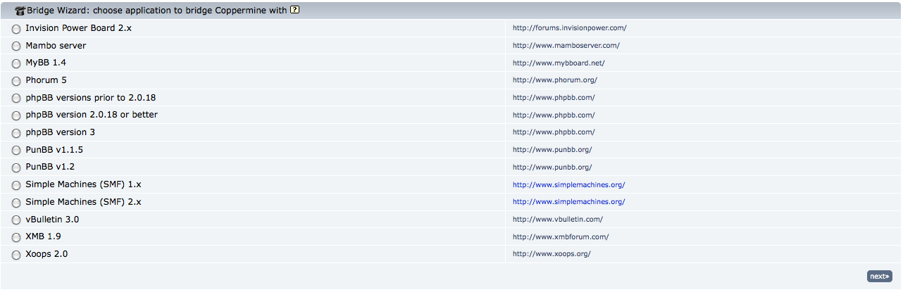In the first actual step of the wizard "choose application to bridge coppermine with", you have to choose the application you actually want to coppermine with. Note that you must have this application already installed on your webserver, it has to be properly configured and must be up-and-running. Don't use the bridge manager yet if you only plan to integrate coppermine with another application later.