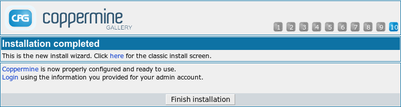 The version cpg1.5.x differs very much from previous versions as much as the install method is concerned: all coppermine versions ever have come with an installer, but in cpg1.5.x the entire install process has been overhauled: the installer now by default has got a wizard-like interface, where you take one step at a time. You're bing led through the entire install process using the wizard, which is a great improvement for beginners. However, if you are a coppermine expert and know your way around the application, you can still use the old install screen: we have bundled it with the package under the name "classic installer". Please understand that it goes unsupported though: if you have issues during install and want support, use the new installer. Questions related to the old installer will not be answered on the coppermine support board. Of course the old installer doesn't have all features that the new installer has: it doesn't create a database for you etc.